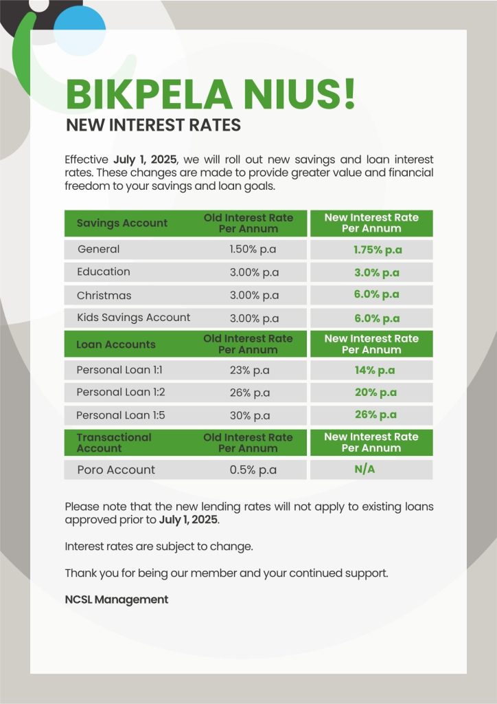 BIKPELA NIUS! – NEW INTEREST RATES