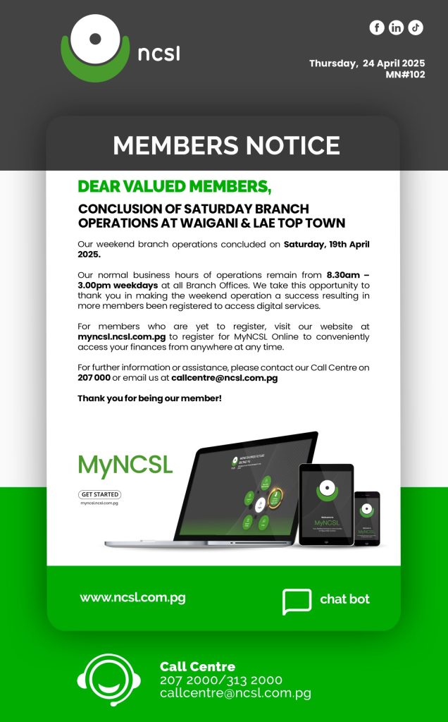 Reminder : Waigani & Lae Top Town Branches Open Easter Saturday