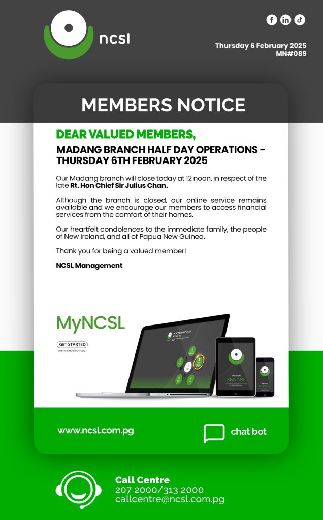 Waigani & Lae Top Town Branches Opens at 8.30 AM Weekdays