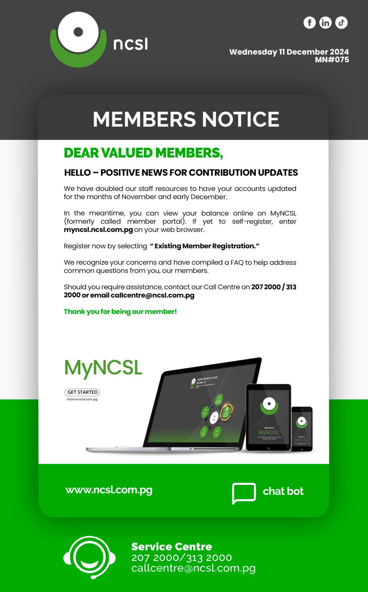 For further assistance, please reach out to our call Centre Team on phone 207 2000 or email :callcentre@ncsl.com.pg