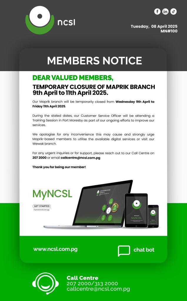 Temporary Closure Of Maprik Branch 9th April to 11th April 2025